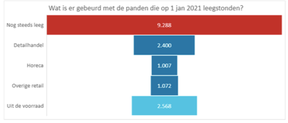 Kijken we naar de panden die op 1 januari 2021 leegstonden (dat waren er 16.335), dan zien we dat 57% van deze panden aan het eind van het jaar nog steeds leeg stonden. Voor ruim een kwart van de panden is een andere invulling binnen de retail gevonden, maar met 16% van de panden is iets gebeurd waardoor het pand nu geen retail meer is. Het overgrote deel daarvan zal zijn omgebouwd naar iets anders en dat zal in veel gevallen een woning zijn.