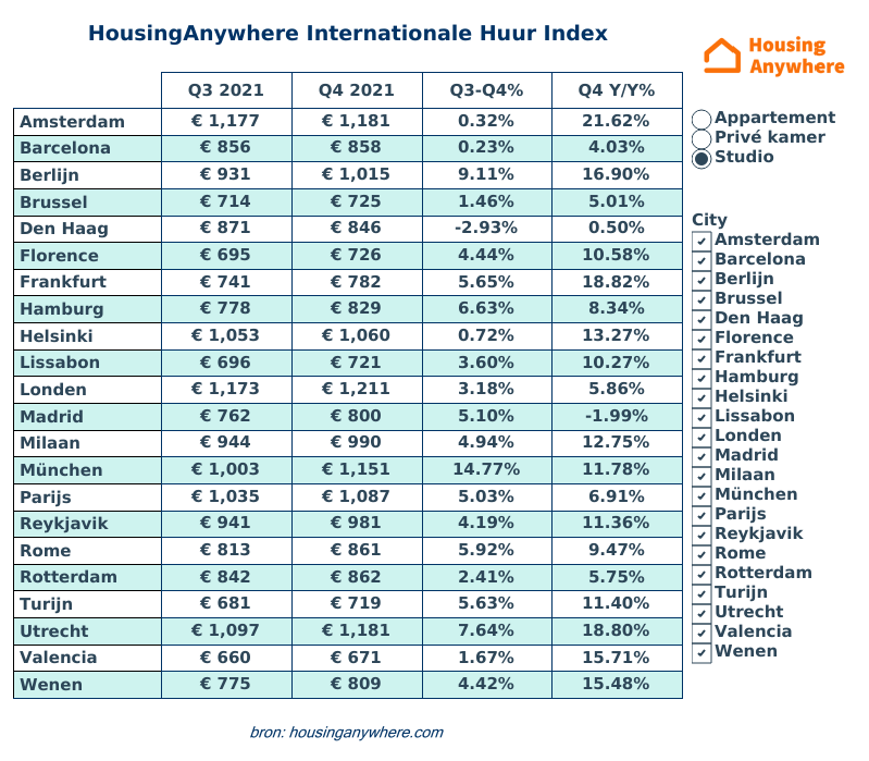 Huurprijzen van appartementen, privékamers en studio’s blijven stijgen in heel Europa, zo blijkt uit het HousingAnywhere Rent Index-rapport van het vierde kwartaal van 2021. Met name de prijzen voor appartementen stijgen hard, maar ook studio's zijn bezig met een inhaalslag. Daarnaast zijn de gemiddelde huurprijzen in vergelijking met Q4 van 2020 ook aanzienlijk gestegen. Deze stijging is het meest opvallend voor Berlijnse appartementen met een prijsstijging van bijna 40% in vergelijking met het laatste kwartaal van 2020.