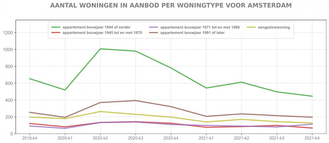 Het totale woningaanbod in de gemeente Amsterdam bedroeg aan het einde van het vierde kwartaal van 2021 979 woningen. 84% van dit aanbod bestaat uit appartementen. T.o.v. van het vierde kwartaal 2020 is het aanbod met 38% gedaald en vergeleken met het derde kwartaal van 2021 met 8%. De vraagprijs van een woning (mediaan) is met 8% gedaald naar €607.900,- t.o.v. het derde kwartaal van 2021. Gemiddeld staan woningen 24 dagen te koop (verkooptijd). Dit is extreem kort, maar wel gelijk aan de looptijd van het derde kwartaal van 2021.