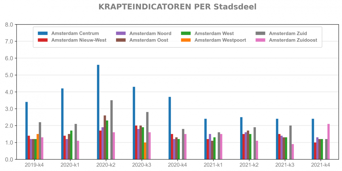 De krapte indicator is afgelopen kwartaal iets gedaald en staat op 1,4 voor de gemeente Amsterdam. Dit betekent dat een potentiële koper in Amsterdam het vierde kwartaal gemiddeld uit slechts 1,4 woningen kon kiezen. Mensen hebben onveranderd extreem weinig woningen waaruit gekozen kan worden. We zien wel verschillen op stadsdeel niveau. De krapte indicator voor stadsdeel Centrum is 2,4 en voor Nieuw-West slechts 1. Dit is de laagste indicator die we de afgelopen jaren in één van de stadsdelen terug zien.