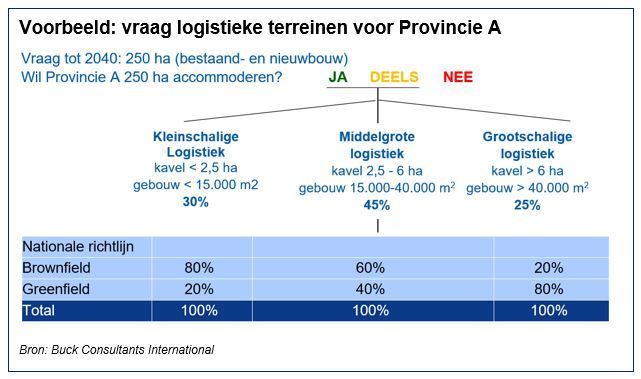 Buck Consultants International stelt voor strengere richtlijnen te hanteren voor de plaatsing van distributiecentra op enerzijds brownfields (bestaande bedrijventerreinen en gebouwen) en anderzijds greenfields (nieuwe logistieke terreinen). Kleinschalige en middelgrote logistiek moet voor het merendeel worden geaccommodeerd op bestaande bedrijventerreinen. Met name voor grootschalige logistiek (kavels van meer dan 6 ha met gebouwen van 40.000 m² of meer) moeten selectief logistieke parken worden ontwikkeld, omdat die in veel gevallen moeilijk in te passen zijn op brownfields. “Door brownfield-optimalisatie te koppelen aan de realisatie van greenfields ontstaat er druk om de bestaande ruimte maximaal te gebruiken en selectief nieuwe logistieke parken te ontwikkelen. Het Rijk moet richtlijnen geven voor die verhouding. Of, in welke mate en wáár regio’s die ruimtevraag willen accommoderen blijft het primaat van provincies”, zo stellen Verweij en Buck.