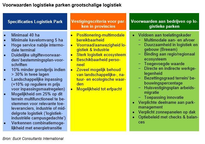 In onderstaand schema vat BCI de voorwaarden voor deze nieuwe generatie logistieke parken samen.