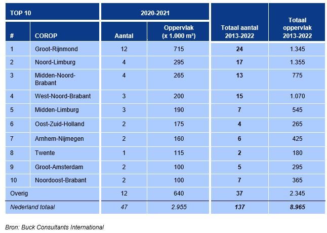 De top 10 van regio’s voor de vestiging van megadistributiecentra ziet er voor de laatste 2 jaren én voor de periode 2013-2022 als volgt uit.