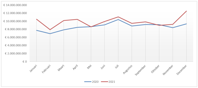 Grafiek: Volume passeringen in euro in 2020 en 2021 per maand