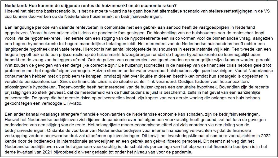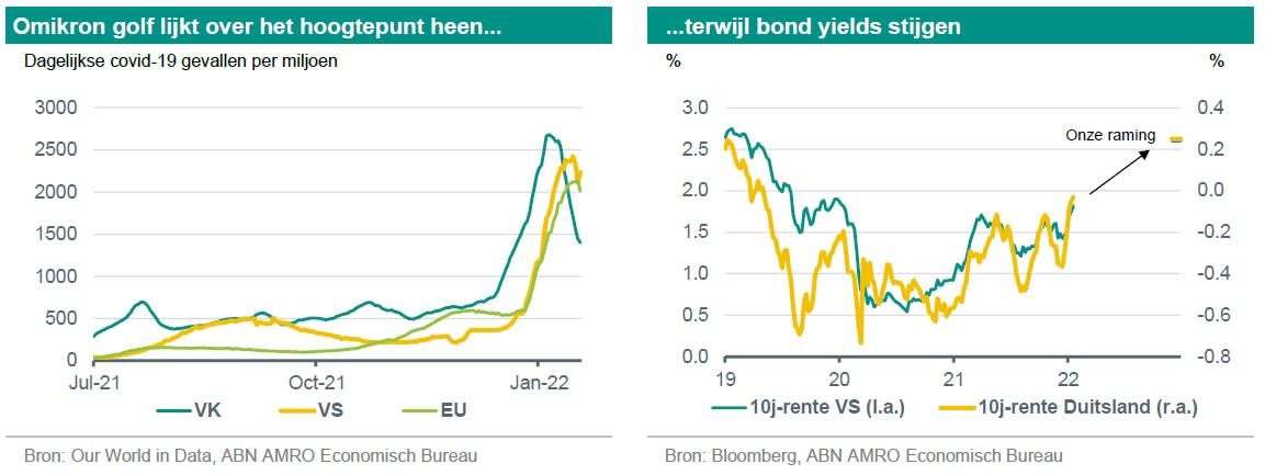 De besmettingen in de belangrijkste geavanceerde economieën lijken over hun hoogtepunt heen. De weinige landen die wel restricties invoerden lijken deze alweer op te heffen. De verspreiding van de omikron-variant heeft een gunstiger effect op de economie dan verwacht. Hierdoor heeft ABN AMRO deze maand onze groeiprognoses voor de komende maanden slechts licht naar beneden bijgesteld. Deze bijstelling kwam vooral doordat het herstel van de dienstensector vertraging heeft opgelopen en door de voortdurende knelpunten aan de aanbodzijde. Tegenover deze lichte neerwaartse bijstelling staat de inflatie. ABN AMRO heeft de inflatieverwachtingen, met name voor de VS en de eurozone, flink naar boven bijgesteld. Het effect van omikron op het monetair beleid is dat de argumenten voor een eerdere verkrapping van het monetaire beleid zijn versterkt. ABN AMRO heeft haar verwachting voor renteverhogingen in de VS opnieuw naar voren geschoven. Ze verwachten echter nog steeds dat de ECB een heel andere koers zal varen dan de Amerikaanse Fed - misschien zullen de renteverhogingen van de ECB nog jaren op zich laten wachten - maar de eurozone zal niet immuun zijn voor de renteverhogingen in de VS. We hebben het begin daarvan al gezien, met een 10-jaars bund yield die vorige week voor het eerst sinds mei 2019 weer positief werd. In de Global View van deze maand geven we updates over hoe omikron onze visie op het herstel heeft bijgesteld, ook gaan we in op hoe markten en economieën reageren op een alternatief scenario met veel steilere rentestijgingen dan we momenteel in ons basisscenario verwachten.