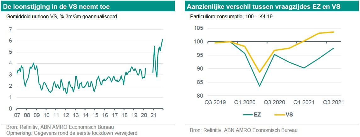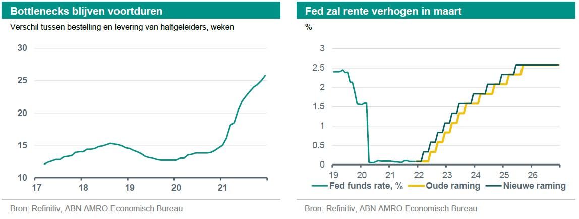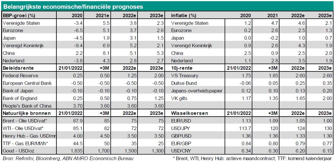 In de VS hebben de aanhoudende opwaartse inflatieverrassingen ertoe geleid dat ABN AMRO haar verwachting voor de eerste renteverhoging door de Fed heeft vervroegd van juni naar maart. Ze verwacht nu dat de inflatie in de VS in 2022 gemiddeld 4,6% zal bedragen, tegen 3,9% in onze prognose van december. Dit komt door verhoogde druk die uitgaat van de producentenprijzen, maar ook met name door de arbeidsmarkt. Nu de werkloosheid met 3,9% onder het niveau van volledige werkgelegenheid ligt, is de loonstijging in december verder versneld tot 6,1% op jaarbasis - het dubbele van het gemiddelde van vóór de pandemie (ongeveer 3%). De hoge inflatie en de krappe arbeidsmarkt blijken in de VS een krachtige cocktail te zijn, waardoor het risico van een loon-prijsspiraal aanzienlijk is toegenomen.