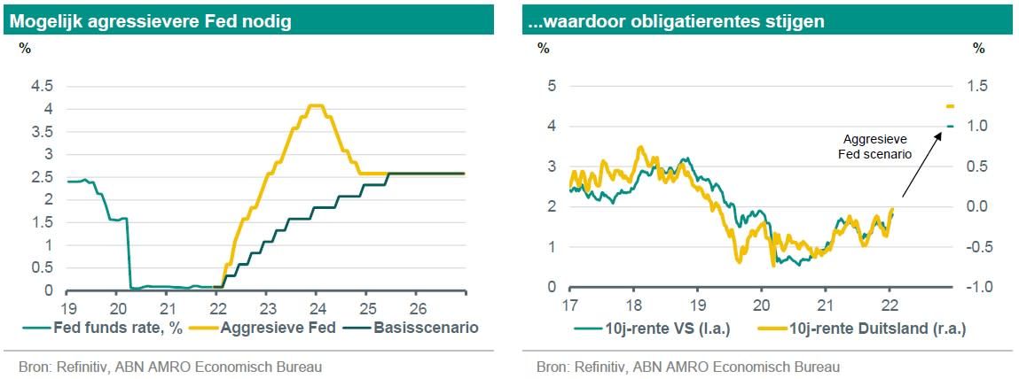 De renteverhogingen door de Fed zijn al naar voren gehaald in de tijd, maar zelfs dit agressievere profiel is afhankelijk van een aanzienlijke daling van de inflatie in het komende jaar. Wat als de inflatie niet daalt, of met minder dan wij verwachten? ABN AMRO denkt dat de Fed in dat alternatieve scenario veel agressiever zal reageren. Dat zou betekenen dat de rente meer dan dubbel zo snel wordt verhoogd als in het basisscenario, met pieken tot 4% tegen eind 2023 - ruim boven het geraamde nominale neutrale percentage van ongeveer 2,5%. Voor alle duidelijkheid, dit is niet het basisscenario van ABN AMRO maar het is nuttig de gevolgen van een dergelijk scenario te onderzoeken.