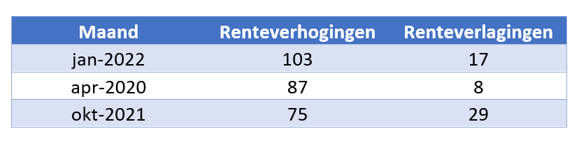 De eerste maand van 2022 heeft al direct een nieuw renterecord neergezet. Gemeten vanaf 2016 was het aantal renteverhogingen door geldverstrekkers nog niet eerder zo hoog. Het herstel van de economie, de hoge inflatie en het anticiperen op het afbouwen van stimuleringsmaatregelen door de centrale banken Fed en ECB zorgen vanaf medio december voor een oplopende marktrente. De marge die aanbieders maken staat daardoor onder druk, vandaar dat geldverstrekkers deze maand massaal tot het verhogen van de hypotheekrente zijn overgegaan.