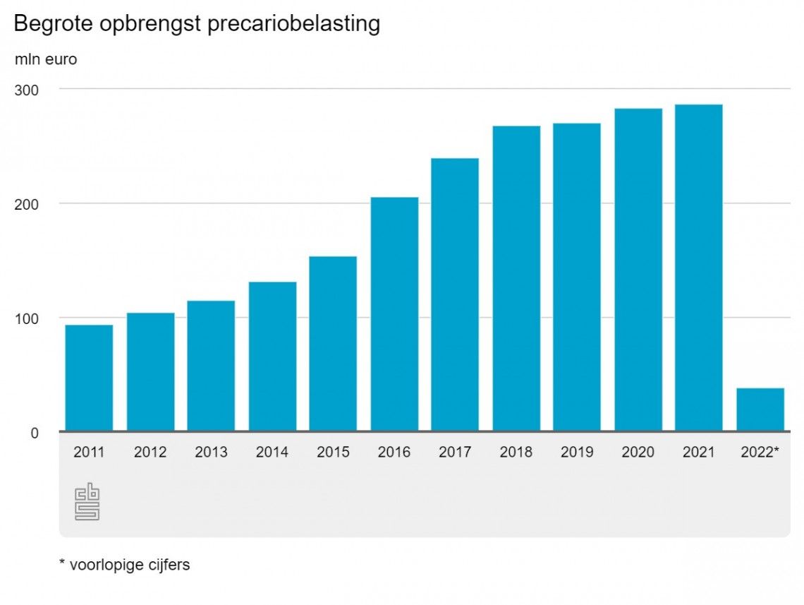 De begrote ontvangsten aan precariobelasting dalen van €287 miljoen in 2021 naar €39 miljoen in 2022, een daling van 86,3%. Gemeenten kunnen precariobelasting heffen als vergoeding voor het gebruik van openbare grond. De forse afname van deze belasting op het gebruik van gemeentegrond heeft te maken met een wetswijziging, waardoor gemeenten met ingang van 2022 geen precariobelasting meer mogen heffen over kabels en leidingen die nutsbedrijven in, op of boven gemeentegrond exploiteren. Vanaf 1 januari 2022 resteren alleen nog de precario-opbrengsten voor het overige gebruik van de gemeentegrond, zoals voor terrassen, (het plaatsen van) bouwmaterialen en uithangborden. De precariobelasting valt onder de overige heffingen.