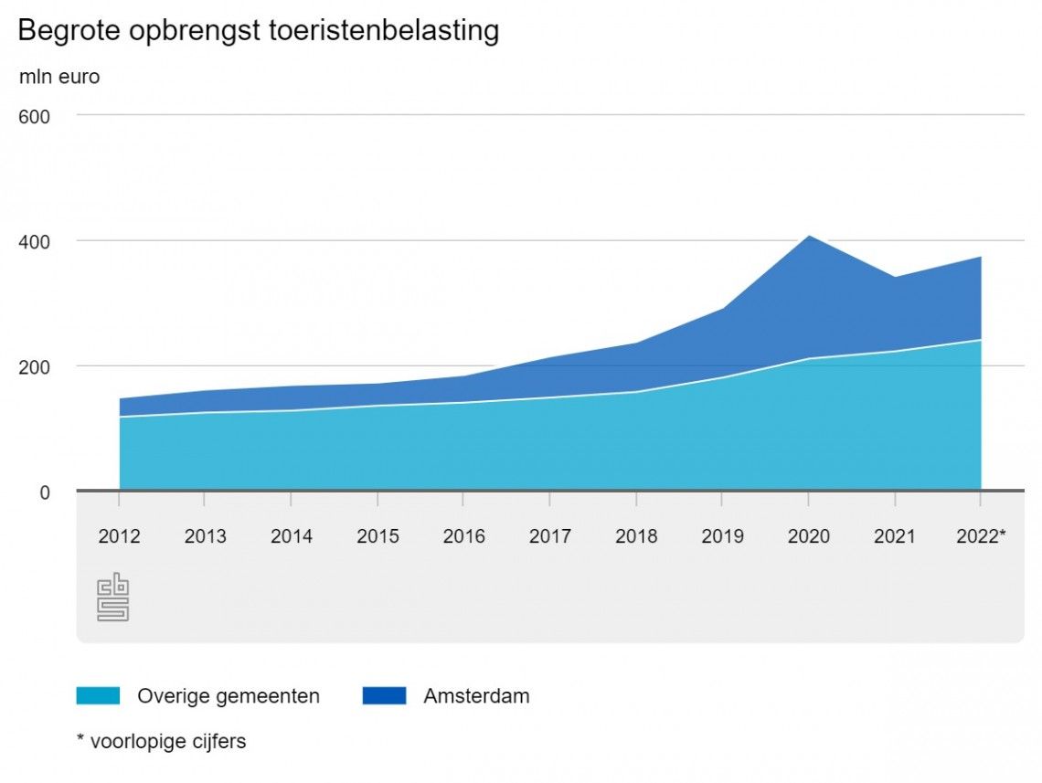 Gemeenten verwachten dit jaar €377 miljoen aan toeristenbelasting te innen. Dit is 33 miljoen meer dan in 2021, een stijging van 9,5%. In 2021 begrootten alle gemeenten tezamen nog een daling van €68 miljoen. Deze daling was echter vooral toe te schrijven aan Amsterdam dat voor 2021 een afname begrootte van €79 miljoen.
