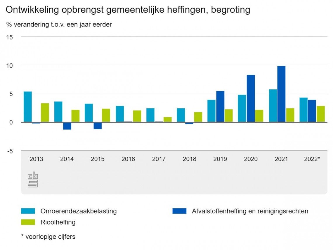 Gemeenten verwachten dit jaar 11,5 miljard euro te ontvangen uit heffingen. Dat is 2,0 procent meer dan in 2021 werd begroot. Dit meldt het CBS op basis van onderzoek naar de gemeentelijke begrotingen van 2022. De onderzochte begrotingen zijn door de gemeenten opgesteld voor 15 november 2021.