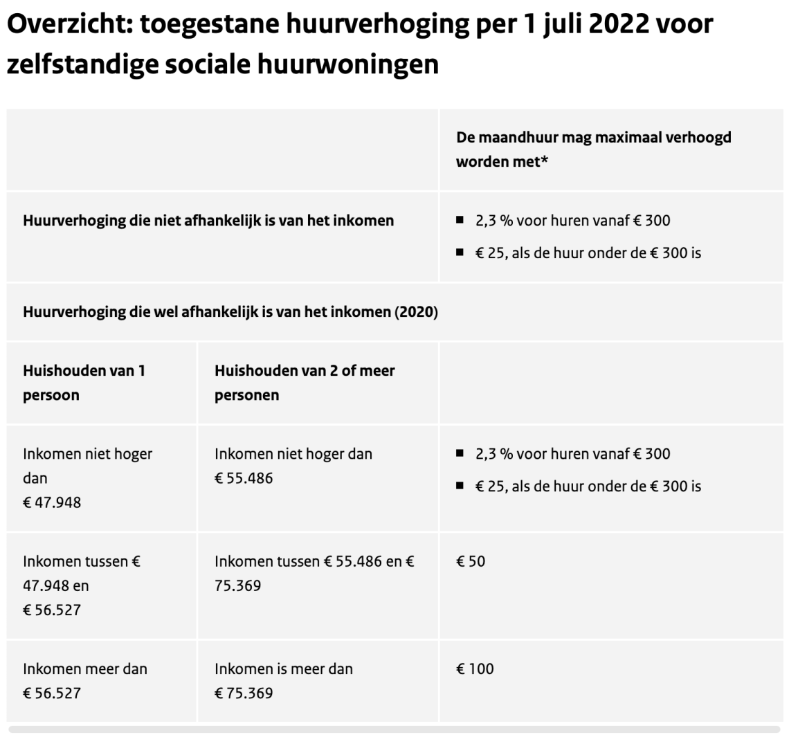 De meeste huurders van een sociale huurwoning kunnen vanaf juli 2022 een huurverhoging krijgen van maximaal 2,3%. De huurverhoging is beperkt tot het gemiddelde jaarinflatiepercentage tot december 2021. Tot 1 juli 2022 mogen de huren van sociale huurwoningen niet verhoogd worden.