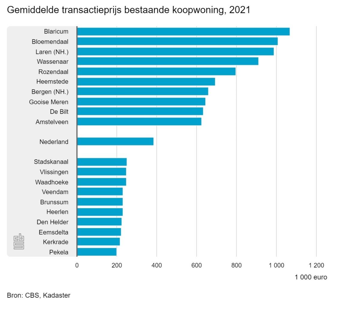 In 2021 verschilde de gemiddelde koopsom in de duurste en goedkoopste gemeenten €867.000. Een jaar eerder was dit verschil nog €699.000. De gemiddelde transactieprijs van een woning in Blaricum was ruim 5 keer zo hoog als in Pekela.