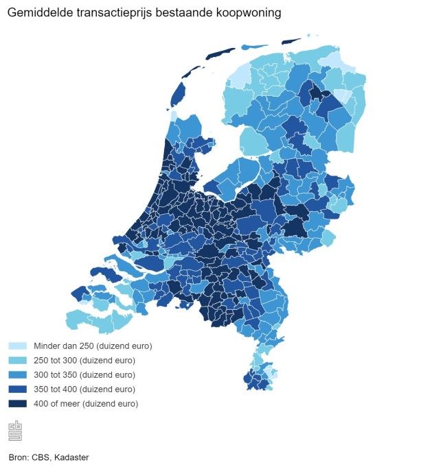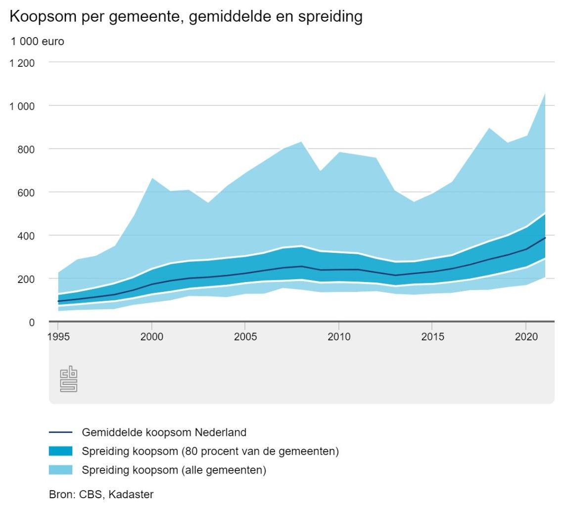 De gemiddelde transactieprijs van een bestaande koopwoning van €387.000 is op jaarbasis de hoogst gemeten prijs sinds het begin van de meting in 1995. Vergeleken met 2020 was de gemiddelde prijs €52.000 hoger. Nagenoeg alle gemeenten in Nederland registreerden een hogere gemiddelde koopsom. Bijna 70 van de 352 gemeenten kenden een koopsom die meer dan 20% hoger lag dan in 2020. In twee gemeenten was de gemiddelde transactieprijs van een koopwoning in 2021 lager dan een jaar eerder, Veere en Ameland.