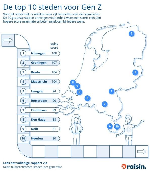 Raisin.nl onderzocht welke Nederlandse steden het beste zijn per generatie en kwam uit op de volgende 10 steden die het meest geschikt zijn voor de generatie Gen Z.