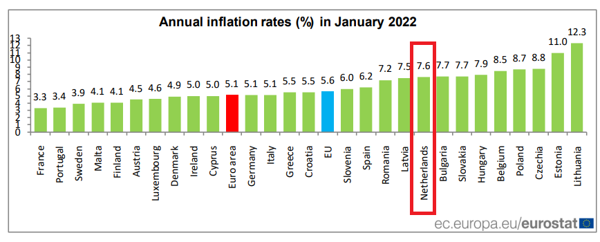 In vergelijking met andere Europese landen zit het Nederlandse inflatiecijfer in de maand januari van 7,6% ver boven het gemiddelde van 5,6%. In de landen waar de euro als betaalmiddel geldt, was de gemiddelde inflatie met 5,1% nog iets lager. Als boosdoener worden de hoge energieprijzen genoemd.