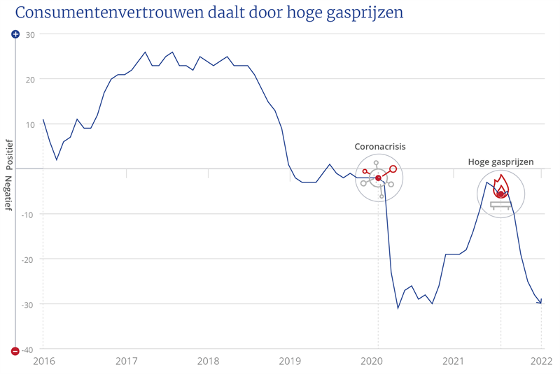 Na de inval in Oekraïne stegen de energieprijzen direct. Dat raakt uiteindelijk iedereen. Het consumentenvertrouwen daalt door de schrikwekkende cijfers 'aan de pomp' en dat leidt weer tot lagere bestedingen. Zo kunnen de hoge energieprijzen een groot domino-effect krijgen in de economie.