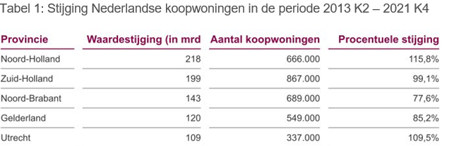 Daarnaast is ook het aantal koopwoningen in Nederland gestegen. Sinds 2013 is het aantal woningen in Nederland met 8,5% toegenomen. Door deze ontwikkelingen bedraagt de totale woningwaarde van de Nederlandse koopwoningvoorraad op dit moment ruim €1,9 biljoen. Deze is daarmee meer dan verdubbeld ten opzichte van de woningwaarde van €900 miljard medio 2013. Om de waardestijging te analyseren, wordt op drie verschillende niveaus ingezoomd: provincie-, gemeente- en wijkniveau.