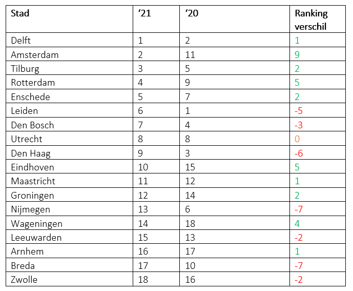 De nummer 1 van vorig jaar, Leiden, is gedaald naar plek 6. Dit komt voornamelijk door de lagere langjarige huurprijsstijging en de toename van aanbod in de pijplijn, zoals More (Bio sciencepark) en Liv aan de Ypenburgebocht; projectren die vorig jaar zijn verkocht. Zo heeft Leiden een significant lagere gemiddelde huurprijsstijging ervaren in de afgelopen zes jaar in vergelijking met bijvoorbeeld de nummer drie, Tilburg. Dit is 15% tegenover 6%.