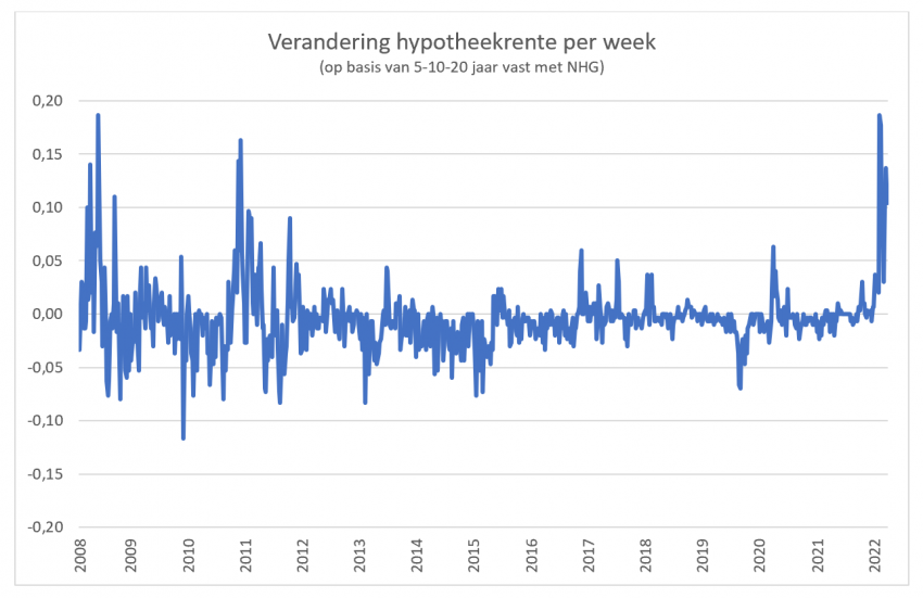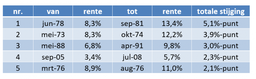 Hoewel we de laatste jaren dus niet meer gewend waren aan een oplopende rente, was dat in het verleden wel anders. In onderstaande tabel (tabel 1) hebben we de grootste stijgingen van de hypotheekrente sinds 1965 opgenomen (gebaseerd op 5 jaar vast). Daaruit blijkt dat met name de jaren zeventig een hectische periode was, waarin de hypotheekrente zelfs regelmatig boven de 10% uitkwam. De huidige toename komt vooralsnog niet in de buurt van de top vijf.