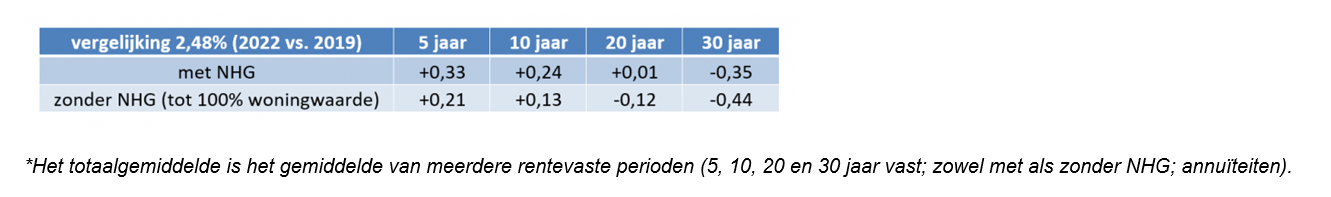 Drie jaar terug (2019, week 6) stond de hypotheekrente net als nu (2022, week 13) ook op 2,48%. Als we echter de samenstelling van het totaalgemiddelde (zie hiervoor tabel 2*) nader bekijken, dan zien we in deze periode twee opvallende verschuivingen. Allereerst is de lange rente (20 en 30 jaar vast) gedaald ten opzichte van de middellange rente (5 en 10 jaar vast). Dat is terug te zien in de gemiddelde renteduur die consumenten kiezen als ze een hypotheek afsluiten: die steeg de afgelopen drie jaar van 16,7 naar 19,4 jaar (bron HDN).