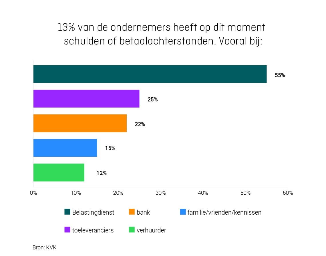 13% van de ondernemers heeft op dit moment schulden of betaalachterstanden, vooral bij de Belastingdienst (55%), toeleveranciers (25%) en banken (22%). Ondernemers duiken op dit moment soms weg voor de schulden die ze hebben, ziet Klein Swormink. Zijn advies: "Hoe moeilijk ook: maak nu je coronabalans op, zie de situatie onder ogen, duik niet weg. Pak nú aan in het belang van je eigen toekomst."