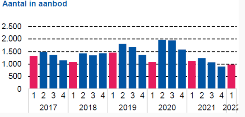 Het totale woningaanbod in de gemeente Amsterdam bedroeg aan het einde van het eerste kwartaal van 2022 975 woningen. Dit is het tweede kwartaal op rij dat het aanbod onder de 1.000 woningen ligt. Een kwartaal eerder was het aanbod met 8% gestegen. Het grootste gedeelte van dit aanbod bestaat uit appartementen (82%).