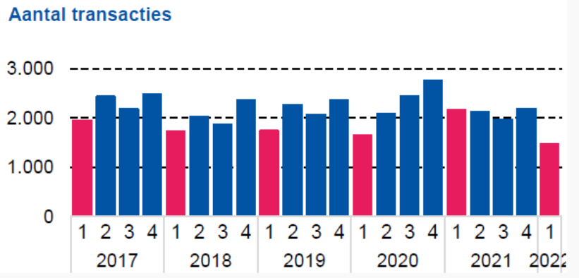 In de gemeente Amsterdam verkochten MVA-makelaars in het eerste kwartaal 1.478 woningen (voorlopig cijfer). Dit is een daling van 32% t.o.v. een jaar eerder, en t.o.v. een kwartaal eerder een daling van 33%. De mediane transactieprijs bedraagt € 559.689,-. Dit is een stijging van 9% t.o.v. een jaar eerder en een daling van 6% t.o.v. een kwartaal eerder. De afgelopen jaren zagen we de transactieprijs elk kwartaal toenemen, we zien voor het eerst sinds het eerste kwartaal van 2020 een daling in de transactieprijs t.o.v. een kwartaal eerder.