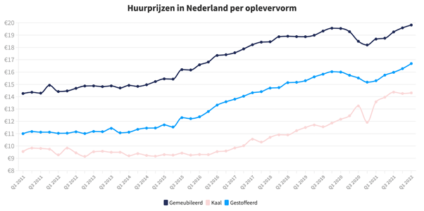 Van alle oplevervormen die Pararius hanteert, steeg de vierkantemeterprijs van gestoffeerde woningen het hardst: nieuwe huurders betaalden €16,69 per maand, zo’n 9,1% meer dan vorig jaar. De duurste oplevervorm, gemeubileerde huurwoningen, steeg gemiddeld naar €19,82 per vierkante meter per maand (+6,1%). Voor kale woningen betaalden nieuwe huurders €14,31 per vierkante meter per maand. Dat is gemiddeld 5,4 % meer ten opzichte van het eerste kwartaal van 2021.