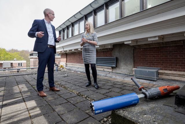 Wethouder Liesbeth van Tongeren van de gemeente Den Haag heeft symbolisch een gat in de muur geboord om te zorgen dat een wisselwerking ontstaat tussen de twee gebouwen waar de koude van de één geruild wordt tegen de warmte van de ander.