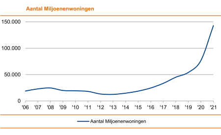 Het aantal miljoenenwoningen is voor het achtste jaar op rij toegenomen. Waren er eind 2013 nog 14.360 woningen met een waarde van boven het miljoen, eind 2021 was dit bijna met een factor tien toegenomen tot ruim 142.900 woningen. Onderstaande grafiek toont de ontwikkeling van het aantal miljoenenwoningen. Hierin is te zien dat het aantal miljoenenwoningen zeker in de laatste jaren exponentieel is toegenomen. De stijging van 69% in het afgelopen jaar is de grootste sinds Calcasa onderzoek doet naar miljoenenwoningen.