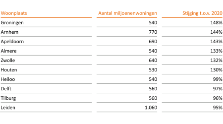 De woonplaatsen met de grootste stijging van het aantal miljoenenwoningen bevinden zich voornamelijk buiten de Randstad. Kijkend naar woonplaatsen met minimaal 500 miljoenenwoningen, dan zien we Groningen bovenaan deze lijst. Ten opzichte van een jaar eerder heeft hier een ruime verdubbeling plaatsgevonden. Arnhem, Apeldoorn, Almere, Zwolle en Houten zijn de andere woonplaatsen waar het aantal miljoenenwoningen meer dan verdubbeld is.