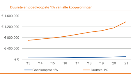 Het verschil tussen de bovenkant en de onderkant van de markt is de afgelopen jaren steeds verder uit elkaar gaan liggen. In 2013 behoorde een huis van 700.000 euro nog tot de top 1% van de markt. Een huis van 54.000 euro behoorde op dat moment tot de goedkoopste 1%. Een verschil dus van 646.000 euro. Aan zowel de bovenkant als de nderkant zijn de prijzen aanzienlijk gestegen. Een huis van 1.385.000 euro behoort nu tot de top 1%, terwijl een waarde van 100.000 euro in de onderste 1% valt. Hiermee is het verschil dus opgelopen tot 1.285.000 euro en op 7.000 euro na een verdubbeling van het verschil in 2013. In onderstaand figuur is deze ontwikkeling weergegeven.