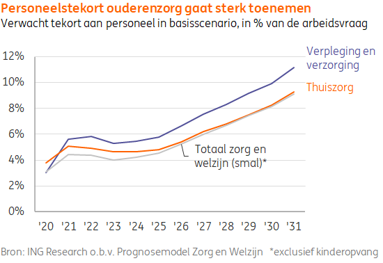 Om de toenemende personeelstekorten het hoofd te bieden is efficiënter werken hard nodig. In de ouderenzorg is nu al sprake van forse personeelskrapte. In de verpleging en verzorging is het tekort ruim 21.000 (6% van het totale aantal werknemers) en in de thuiszorg zo’n 7.500 (5%). Volgens de laatste verwachtingen lopen deze tekorten op tot respectievelijk 57.000 (11%) en 17.000 (9%) in 2031.