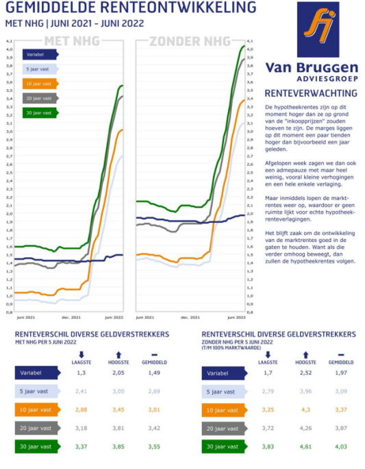 Uit een analyse van Van Bruggen Adviesgroep wijzigden slechts 1 op de 3 geldverstrekkers de afgelopen week de hypotheekrentes. Dat waren over het algemeen kleine hypotheekrenteverhogingen voor een beperkt aantal rentevaste periodes. Eén geldverstrekker verlaagde de hypotheekrentes licht.