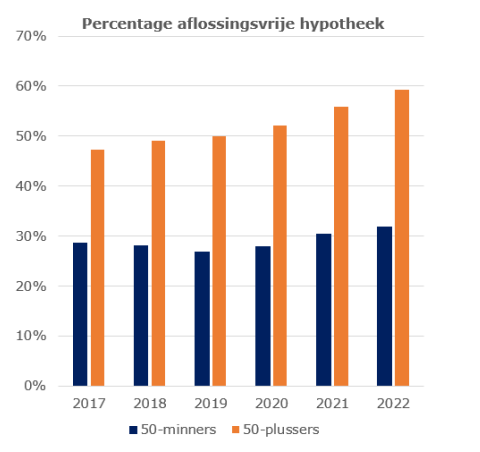 Daarnaast is bijna 60% van hypotheken aflossingsvrij bij 50-plusser; tegen 'slechts' 32% bij 50-minners. De belangrijkste oorzaak is dat de meeste 50-plussers al beschikken over veel overwaarde. Aflossingsvrij geeft veel lagere maandlasten dan een aflossende hypotheek, terwijl de hypotheek ook in de toekomst veelal prima betaalbaar is en door de rente lang vast te zetten creëren ze meer zekerheid.