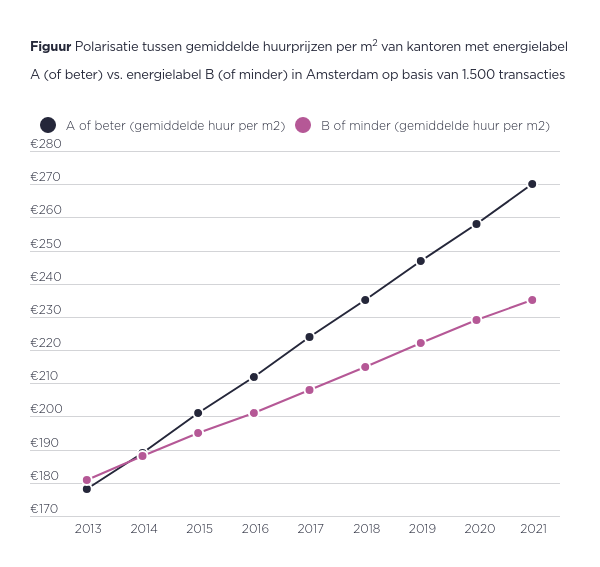 Niet alleen de vraag naar kantoren met energielabel A (of beter) neemt toe, maar ook de gemiddelde huurprijs ervan. In Amsterdam betalen gebruikers inmiddels gemiddeld €35 per m² meer voor een kantoor met energielabel A of beter dan voor een kantoor dat minder scoort. Dit terwijl er in 2013 nog geen verschil zichtbaar was tussen beide huurprijzen.