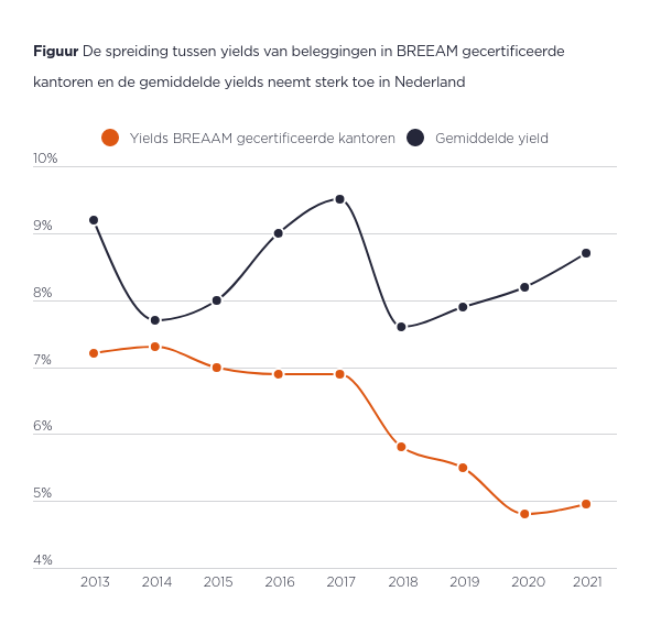 Ondanks de stijgende kosten voor nieuwbouw en verduurzaming van bestaande kantoorgebouwen, blijft de interesse van beleggers in duurzame kantoren groot. Het bruto aanvangsrendement van BREEAM gecertificeerde objecten is in de afgelopen jaren steeds verder afgenomen: vorig jaar bedroeg deze gemiddeld 4,95%, terwijl dat in 2018 bijvoorbeeld nog 5,80% was. In diezelfde periode is het gemiddelde bruto aanvangsrendement van kantoren daarentegen juist toegenomen van 7,60% tot 8,70%. Dit betekent dat de yield spread tussen beide van 180 basispunten in 2018 inmiddels ruim is verdubbeld tot 375 basispunten in 2021.