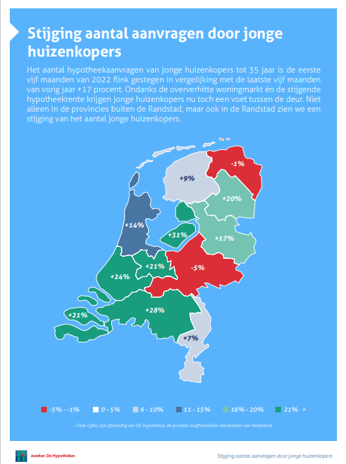 Dat is een duidelijke kentering ten opzichte van voorgaande kwartalen, toen juist sprake was van een flinke daling van het aantal aanvragen in deze leeftijdsgroep. Nu de huizenmarkt iets lijkt af te koelen, wordt het voor jonge huizenkopers eenvoudiger om een woning te kopen. Zo krijgen zij niet alleen meer kansen in de buitengebieden - met Flevoland (+31%), Noord-Brabant (+28%) en Zeeland (+21%) als uitschieters - maar óók in de Randstad, vooral in Zuid-Holland (+24%) en Utrecht (+21).