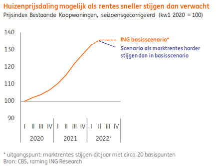 Uitgaande van een geringe verdere rentestijging in 2022 (rond de 0,2%-punt), is de verwachting van de analisten van ING nu dat de huizenprijzen stabiliseren. Bij een snellere rentestijging dan verwacht is het echter reëel dat de huizenprijzen zullen dalen.
