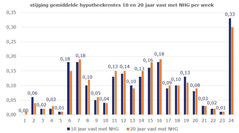 In de onderstaande grafiek staat de stijging van de gemiddelde hypotheekrentes voor 10 en 20 jaar vast met NHG. Bij de 10 jaar vaste rente hebben we ook de wekelijkse stijging in een getal boven de staaf geplaatst. Afgelopen week was dus een uitzonderlijke week. Verder viel op dat de gemiddelde stijging voor de kortere rentevaste periodes iets groter was dan voor de langere periodes.