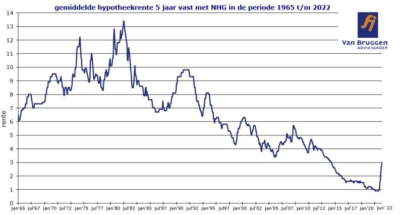Van Bruggen Adviesgroep laat weten dat de we de afgelopen week te maken hadden met de grootste stijging van deze eeuw, met een stijging van de gemiddelde 10 jaar vaste hypotheekrente van meer dan 0,3%. Terwijl het eerste deel va dit jaar sowieso al gekenmerkt werd door enorm veel grote renteverhogingen, met gemiddeld een tiende per week. Wanneer een econoom dit vorig jaar voorspeld zou hebben, zou deze voor gek zijn verklaard. Ondanks de hele hoge inflatie is de hypotheekrente in historisch perspectief nog altijd laag.
