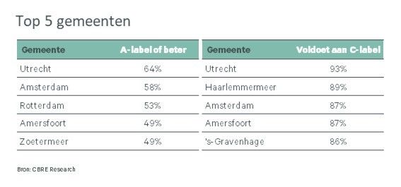 Van de 25 gemeenten met de grootste kantorenvoorraad, is Utrecht de duurzaamheidskoploper. Ruim 93% van de kantoren is er klaar voor nieuwe wetgeving en bijna 64% heeft zelfs een A-label, of beter. Slechts 3,6% moet het met een ‘D’ of lager stellen, en 3% heeft op dit moment nog helemaal geen energielabel.
