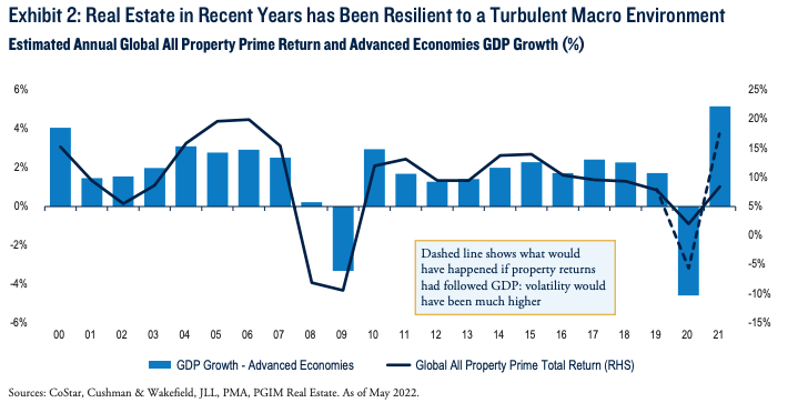 Hoewel de inflatie plotseling is teruggekeerd, wijzen de recente prestaties van vastgoed als beleggingscategorie erop dat het goed gepositioneerd is om wat er ook komt - recessie of geen recessie - te doorstaan. Dat geldt met name voor vastgoedsectoren waar een structurele behoefte aan meer ruimte bestaat, zoals betaalbare huisvesting en logistieke distributiecentra, maar ook voor opkomende segmenten zoals datacenters en medische faciliteiten, waar de vooruitzichten voor huurgroei sterk zijn.