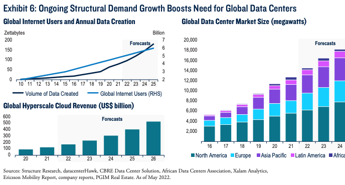 De afgelopen 40 jaar vormde vastgoed een bijna perfecte bescherming voor inflatie. Datacentra vormen weliswaar een relatief klein vastgoedsegment in vergelijking met gevestigde sectoren zoals kantoren en winkelvastgoed, maar bieden sterk potentieel voor huurinkomstengroei. De internetindustrie is de afgelopen decennia in een exponentieel tempo gegroeid. Ook de hoeveelheid data is sterk toegenomen, met name in de afgelopen tien jaar. Het aantal internetgebruikers wereldwijd is jaarlijks met 8% gestegen en de groei van de data heeft die ontwikkeling ruimschoots overtroffen, met een gemiddelde jaarlijkse toename van 32% in dezelfde periode. Dit komt met name door meer geavanceerde technologieën en een toegenomen gebruik per hoofd van de bevolking, wat resulteert in een stijgende vraag naar datacenters.