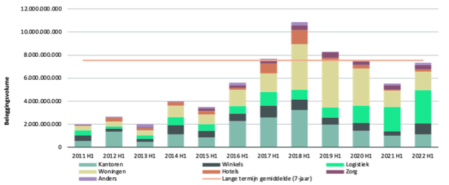 Met een beleggingsvolume van € 1,6 miljard in het eerste halfjaar van 2022 blijft de woningmarkt sterk achter bij de topjaren van 2018 tot 2020. De voornaamste reden is de dreigende regulering voor het middeldure huursegment. Dit heeft direct impact gehad op het beleggingsvolume van nieuwbouwhuurwoningen. De afgelopen zeven jaar kwam het slechts twee keer eerder voor dat het beleggingsvolume voor nieuwbouw zo laag uitviel als dit kwartaal. Dit terwijl het vergunningsniveau juist aanzienlijk hoger ligt dan in de voorgaande zeven jaar.