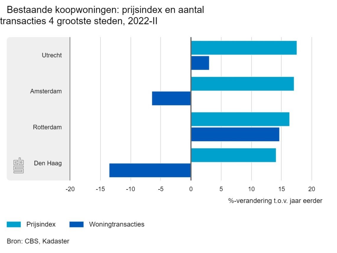 Het aantal woningtransacties was in het tweede kwartaal in Rotterdam 14,7% en in Utrecht 3,1% hoger dan een jaar eerder, terwijl in Den Haag en Amsterdam respectievelijk 13,5 en 6,4% minder woningen van eigenaar wisselden. De stijging van het aantal transacties in Rotterdam en Utrecht valt op. In het eerste kwartaal van 2022 lag het aantal transacties in Rotterdam en Utrecht nog respectievelijk 34,4 en 37,6% lager dan een jaar eerder.