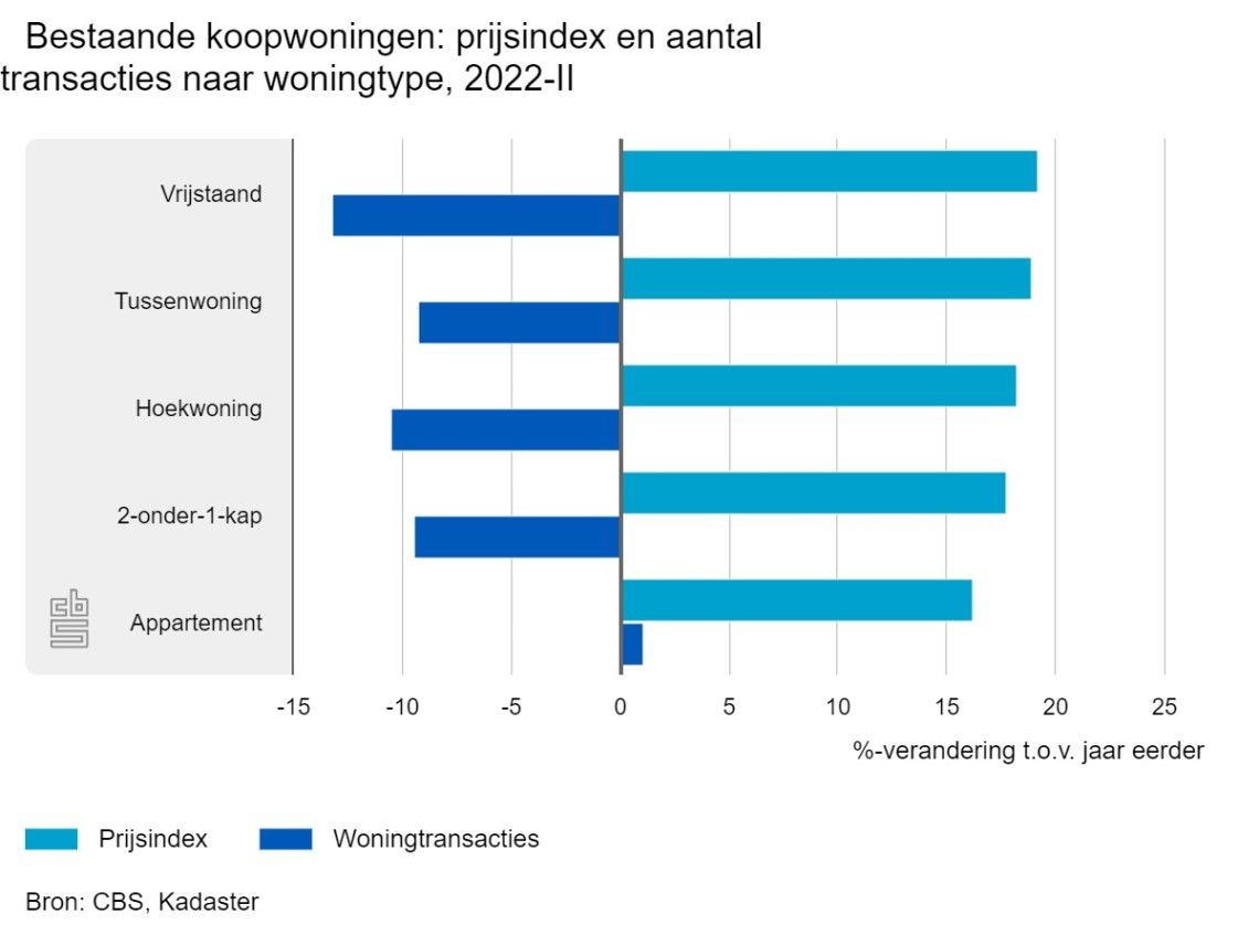 Alle woningtypen waren in het tweede kwartaal van 2022 duurder dan een jaar eerder. De prijsstijging van vrijstaande woningen was met 19,2% het grootst. Van bijna alle woningtypen was het aantal transacties lager dan een jaar eerder. Uitzondering waren de appartementen. Hiervan zijn er ruim 1% meer van verkocht dan in het tweede kwartaal van 2021.