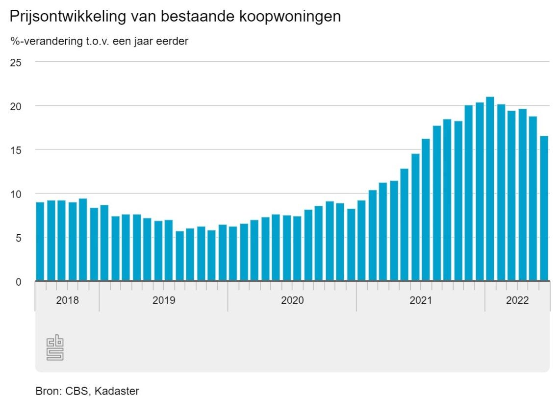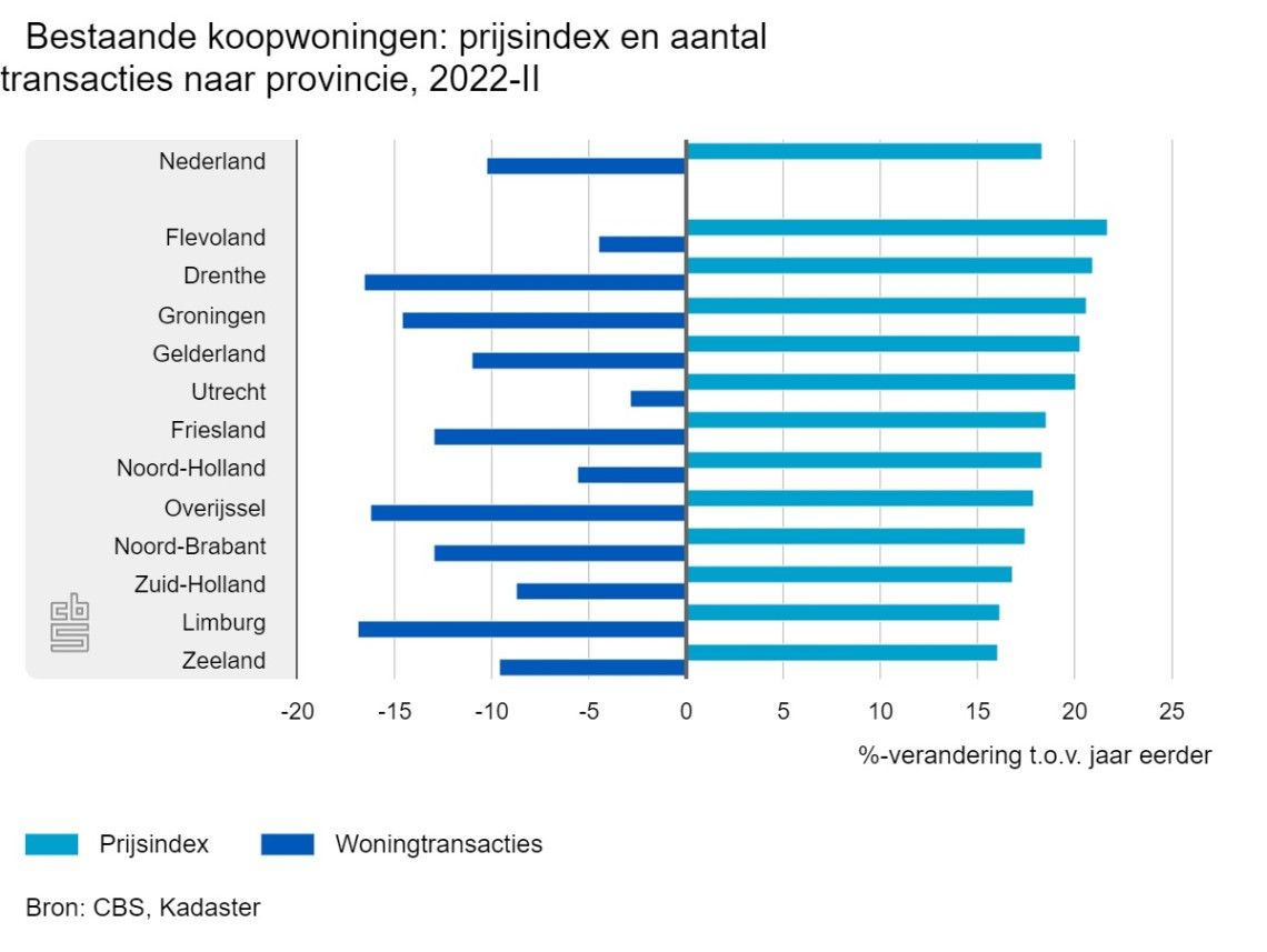 De prijsstijging van bestaande koopwoningen in Nederland kwam in het tweede kwartaal van 2022 uit op 18,4%. Een kwartaal eerder was dat 20,3%. In bijna alle provincies vlakte de prijsstijging af. Alleen in Drenthe en Overijssel bleef de stijging respectievelijk gelijk c.q. vrijwel gelijk. Verder was in de helft van de provincies de prijsstijging groter dan gemiddeld in Nederland. Met 21,7% was de prijsstijging opnieuw het grootst in Flevoland. In Zeeland was de prijsstijging, met 16,1%, het kleinst.