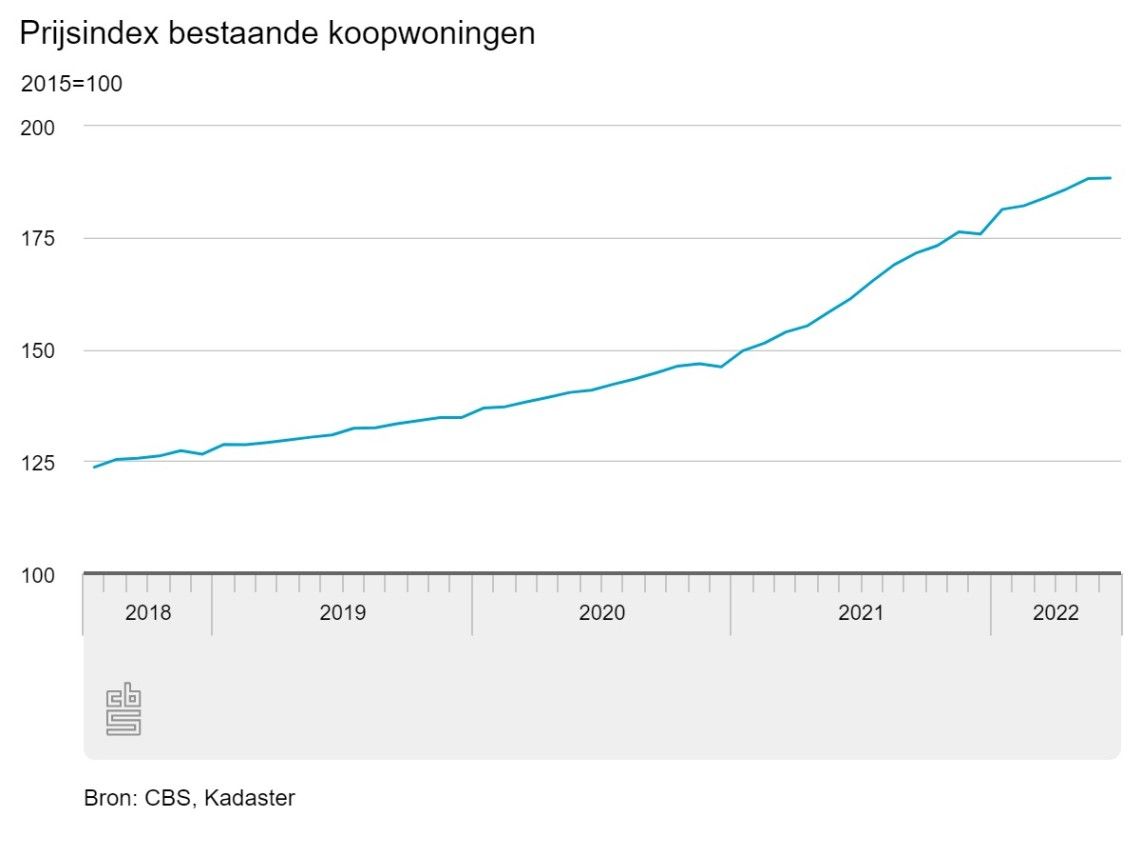 De prijsindex bestaande koopwoningen is in juni 2022 nauwelijks gestegen. De prijzen van bestaande koopwoningen bereikten in juni 2013 een dieptepunt. Sindsdien is er sprake van een stijgende trend. Vergeleken met het dal in juni 2013 waren de prijzen in juni ruim 98% hoger.